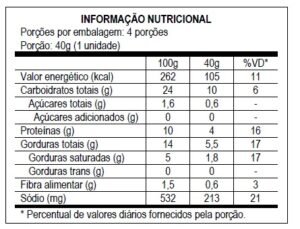 Ingredientes: farinha de trigo enriquecida com ferro e ácido fólico, leite integral, brócolis, cenoura, queijo muçarela, ovo, óleo de canola, fermento em pó, sal, e pimenta do reino.
